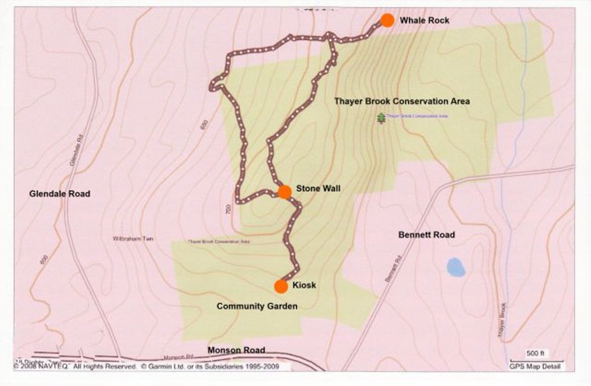 - Directions: From Main Street in Wilbraham, take Monson Road heading towards Monson, Massachusetts. Proceed over the mountain past Ridge Road on the left and down into the valley. Pass Hollow Road on the right and Glendale Road on the left. The entrance to the Community Gardens is just past Glendale on the left. There is a small sign at the entrance to the driveway that says "Community Garden." Make the turn and take your first right. Park as far down the dirt road that runs parallel to the Community Garden as you can. To access the trail head on foot, walk around the back of the garden (where the garden meets the wood line) to the north east corner. There you will see the Thayer Brook Kiosk and a small, matted down, grassy entry path.